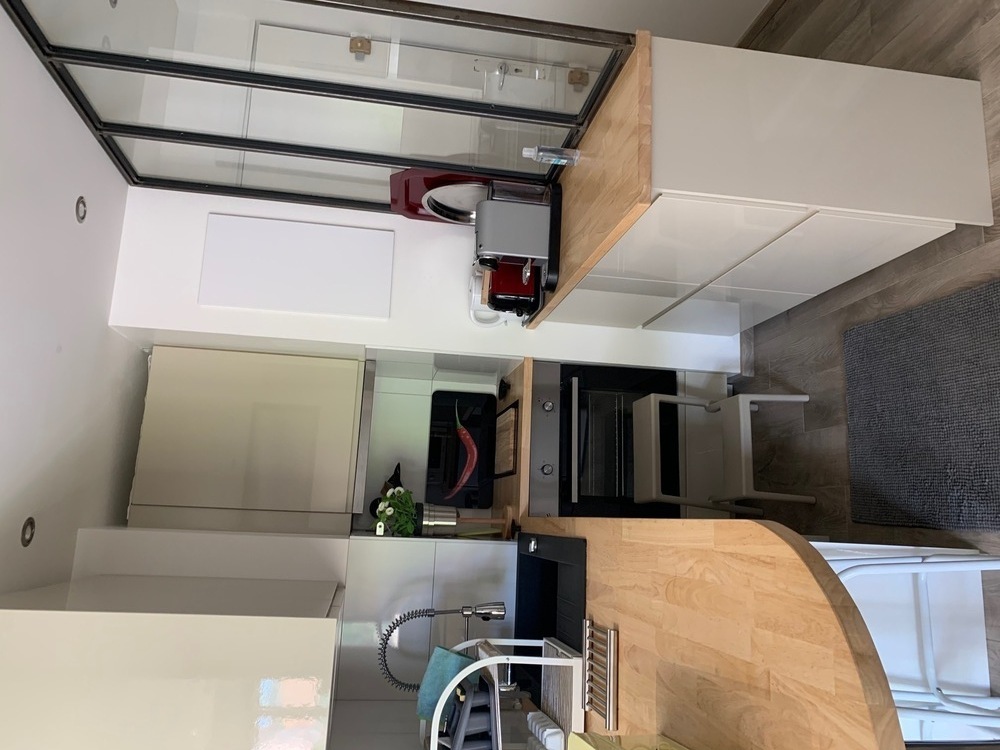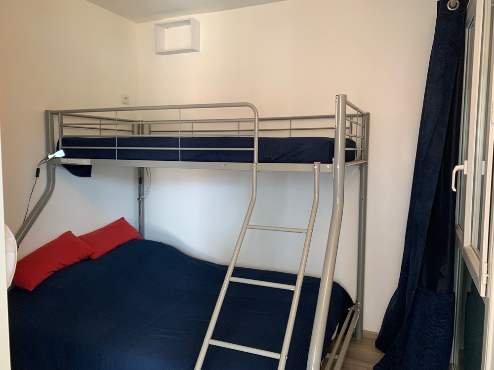Séjour avec coin cuisine équipée ( plaque, hotte, four, lave vaisselle, micro ondes ) , une chambre avec lit superposé en 140 et en 90, salle d'eau, wc séparé.