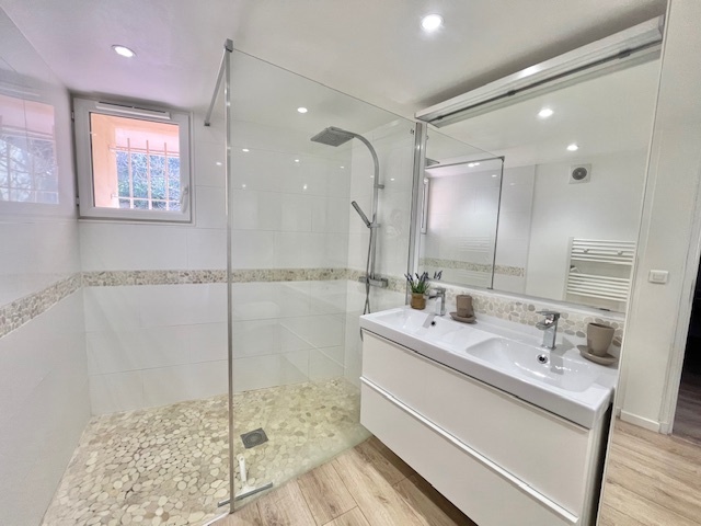 Au RDC : grande pièce principale côté poste de Cassis avec cuisine US ultra équipée, une chambre avec 2 lits enfants, une grande salle d'eau avec WC