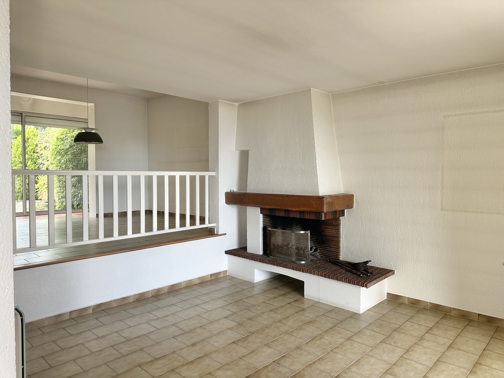 Un grand salon avec cheminée, ouvrant sur une vaste terrasse plein sud avec une magnifique vue mer et Cap Canaille.