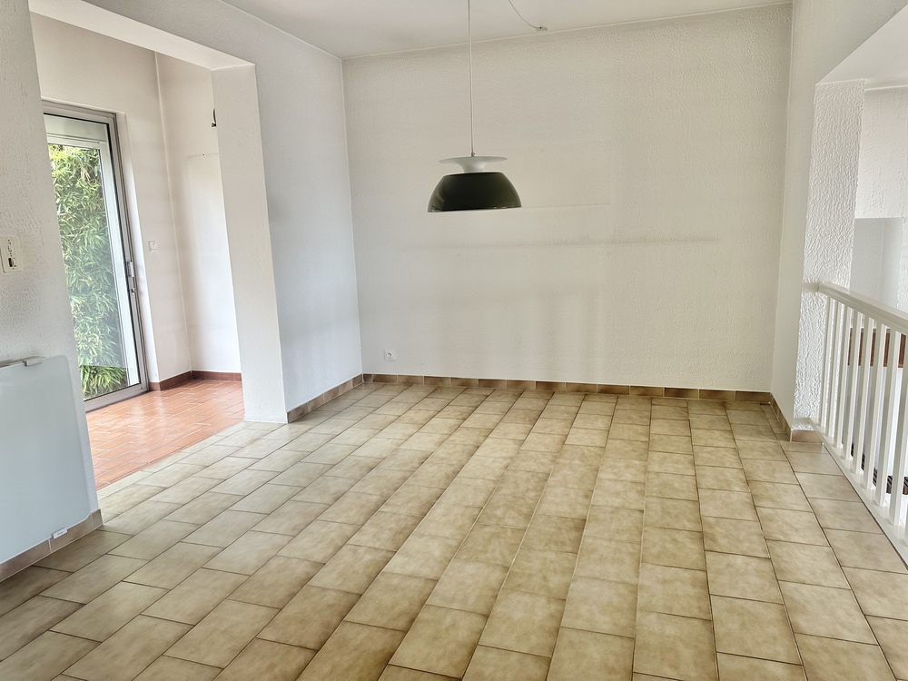 Sur un demi-niveau : une salle à manger lumineuse donnant sur une loggia et un jardin privatif arboré et clôturé, parfait pour les repas en extérieur ou les moments de détente.
