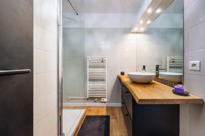 1er étage : un séjour lumineux ouvrant sur une terrasse avec jardin, une cuisine américaine moderne, une chambre avec sa salle d’eau privative et balcon, ainsi qu’un WC indépendant.