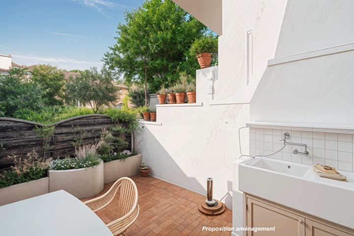maison de ville de 135m2 bénéficiant d'une cour en rez-de-chaussée et d'une terrasse tropézienne au 2° étage.