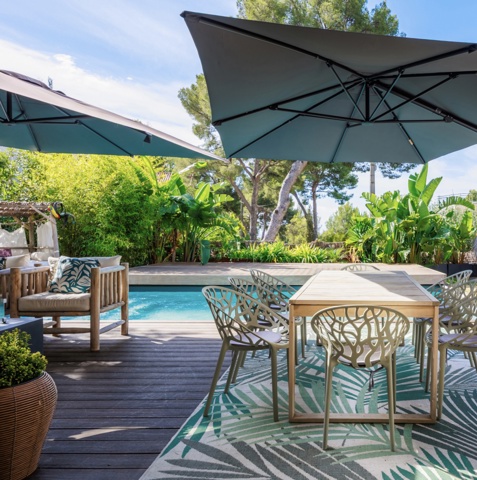 Chaque pièce du rez-de-chaussée bénéficie d’un accès direct au jardin, à la piscine, au terrain de pétanque et aux espaces détente, dans une atmosphère résolument méditerranéenne.